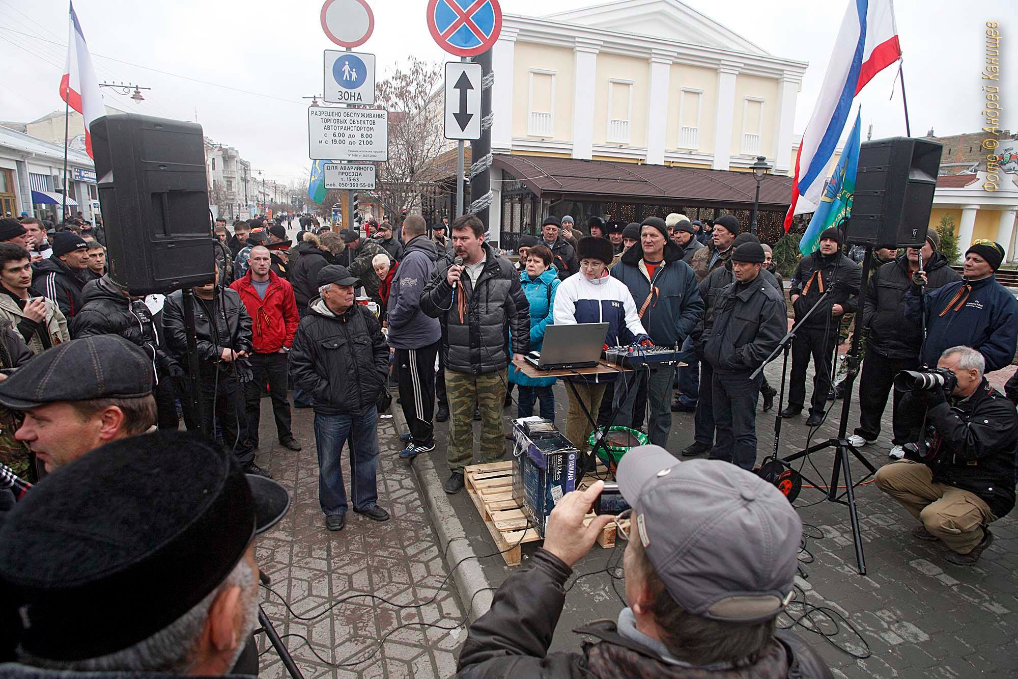 “When there’s no news, they sing songs,” says Kanishchev. As he stood there listening, an announcement was made that the Russian special forces had blocked Ukrainian border guards in Balaklava, and there were shouts of approval and applause. When the announcement was made of Yanukovych’s press conference in Rostov-na-Donu, there was a few claps.