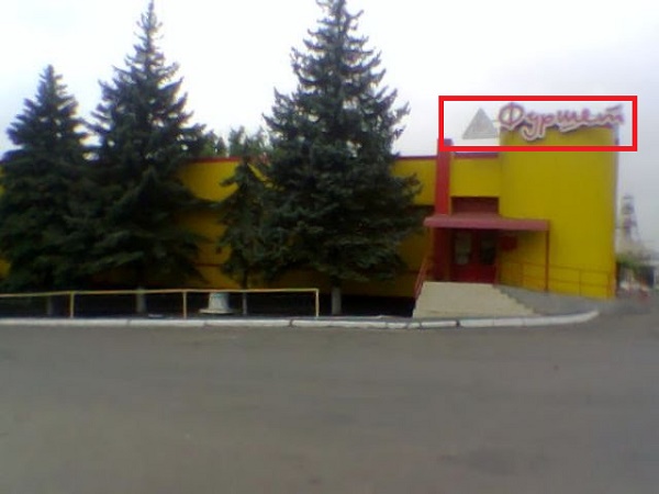 We can compare the Panoramio photo of the building with a screenshot from the video. Note the signage: