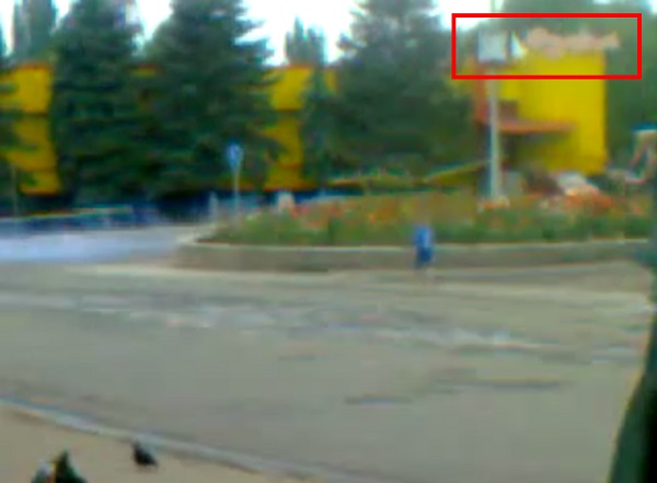 We believe we have located this video as being filmed in Snezhnoye. The yellow building and roundabout are visible on Google Maps in the town.