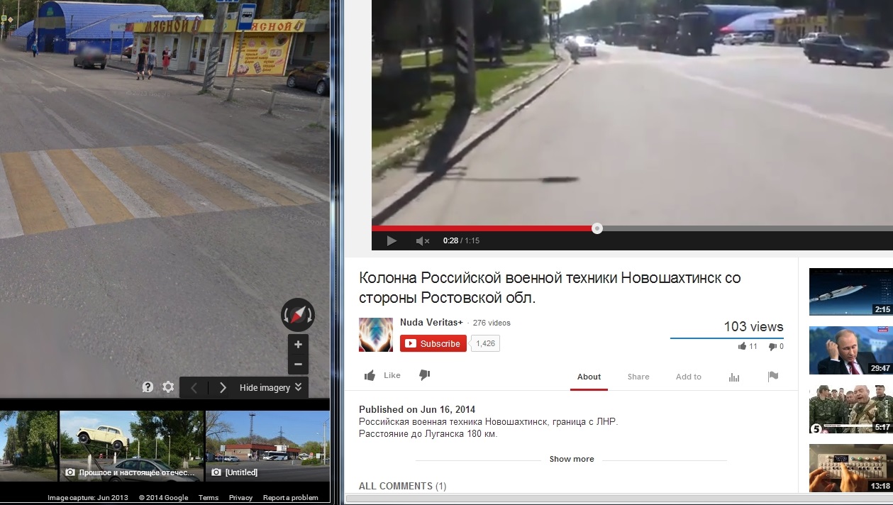 The following video was reportedly taken in Novoshakhtinsk, but we have definitively been able to verify the location (here). It was uploaded today. Below are screenshots from Google streetview that verify the location:
