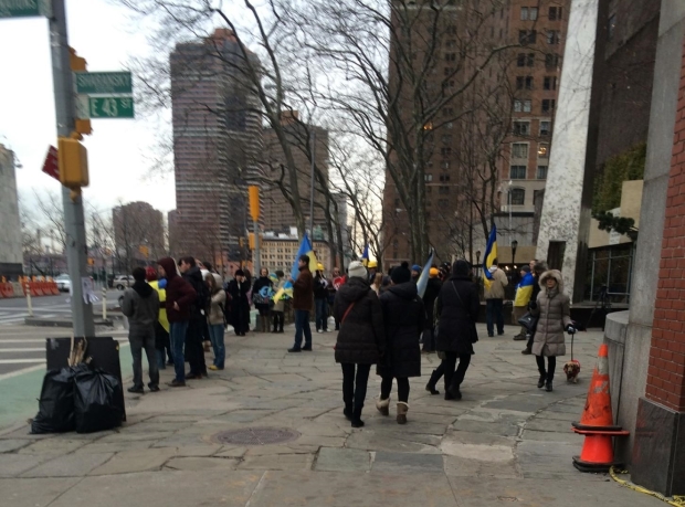 Ukrainian picketers at UN today. Photo by Hallie Shatravka