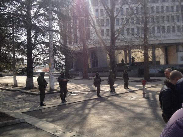 Armed men in green fatigues and masks now standing outside the parliament in Simferopol. Clearly professionals. pic.twitter.com/QLqSdt2S45