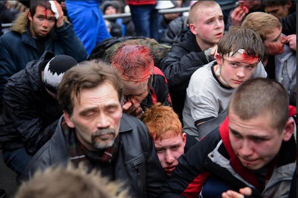 1603 GMT: Russia might be the fiercest military force in Ukraine, but it’s not the only force that’s fighting right now. Clashes have erupted as pro-Euro protesters were attacked by pro-Russian crows in Kharkiv today: