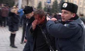 “Several dozen people approximately were injured in Kharkiv today (figures from 68 to 106 have been provided). Many have head and facial wounds (they were beaten by baseball bats). Serhiy Zhadan was also beaten over the head and had an open head wound (it was stitched in the hospital). Then he was dragged out on a stage that was set up right there on the square and they demanded that he kneel down and ask for forgiveness. He told them to screw off. After that, he was led away by policemen. Now he is ok and is talking on the Internet.”