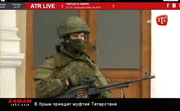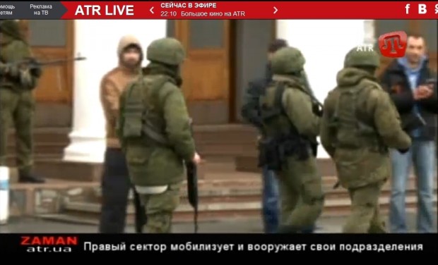 At 20:30 this evening, ATR carried a special broadcast on the issue of just what kind of troops have occupied their city. First, they ran footage from the State Department’s noon briefing quoting Jen Psaki reply to a reporter that the State Department had “no independent confirmation” of reports of Russian intervention in the Crimea. Then ATR aired scenes of the armed, uniformed men who seized the airport in Simferopol and are also guarding the parliament building (see some of the screenshots below). They asked independent war correspondent Andrei Babichenko in Moscow his opinion on what kind of forces they were seeing.