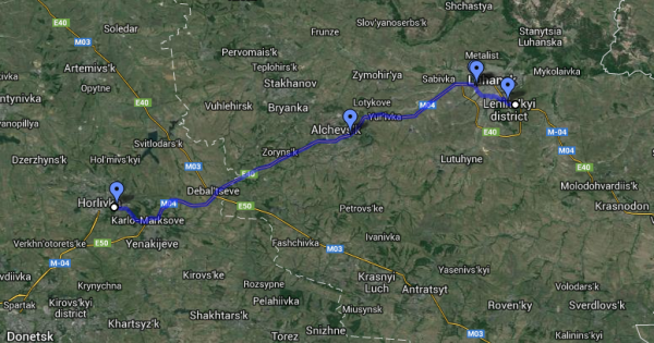 These photos, which we haven’t verified yet, but which do appear to show the same column, we purportedly taken near Debaltseve, which would fit with the prospective route above.