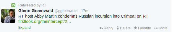 Glenn Greenwald is impressed by Abby Martin’s show if independence, and points out that RT itself is promoting Martin’s editorial (and Greenwald’s editorial on it):