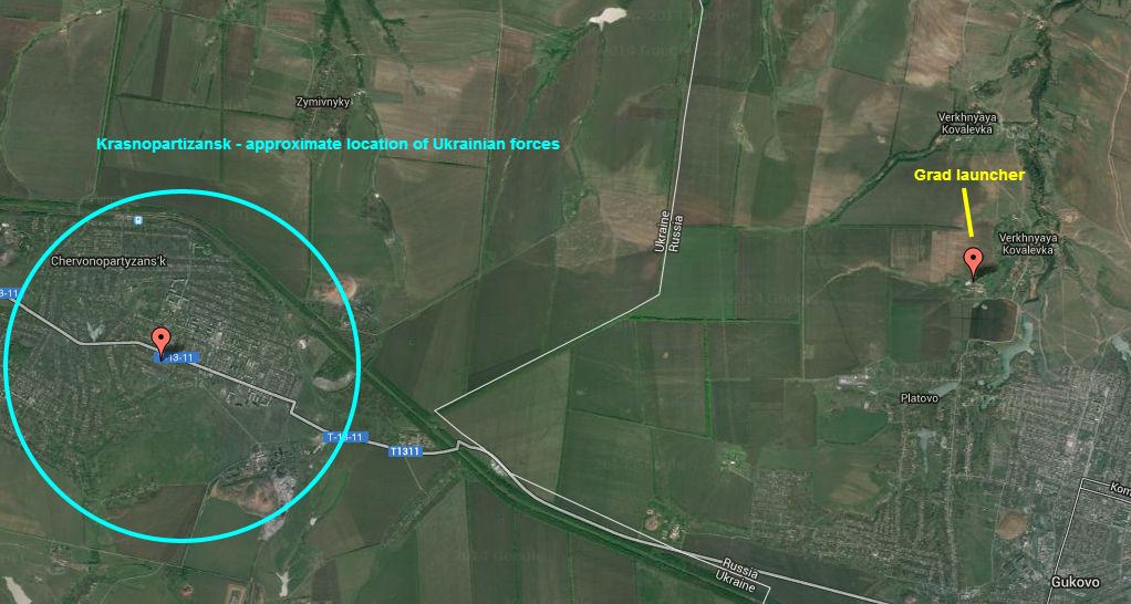 Ukrainska Pravda reports that a soldier from the Ukrainian 72nd Mechanised Infantry Brigade has described a Grad rocket attack on the units positions. The location of the soldiers, near Krasnopartizansk (known in Ukrainian as Chervonopartizansk), is well within range of the Grad battery firing from Gukovo that we reported on last night.