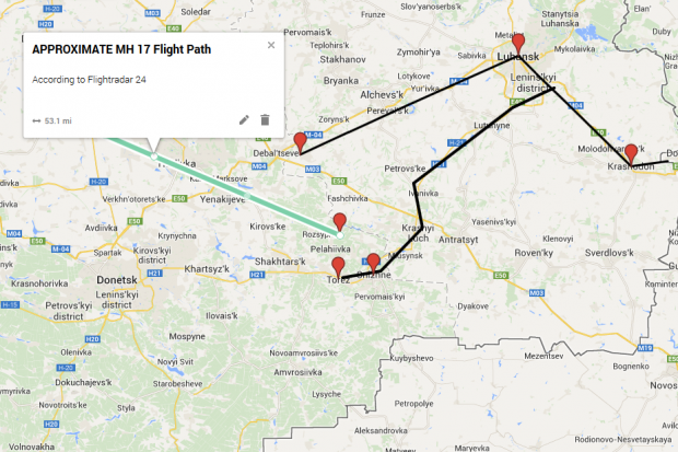 This is a helpful piece of data, and we’ll try to get a more exact flight path if we can, because it helps place all of these claims of where a surface-to-air missile may have been fired from. Not only do these weapons have a maximum altitude (which has been discussed at length by us, the rest of the media, and world powers) but they have a maximum range, a lateral range that is.