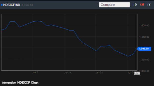 The Micex Index added 2 percent to 1,397.12 by 11:32 a.m. in Moscow, trimming its July decline to 5.4 percent. That’s still the worst monthly loss since May 2012. VTB, Russia’s second-largest bank, retreated as much as 3.8 percent and traded down 0.4 percent. Sberbank jumped 3 percent.