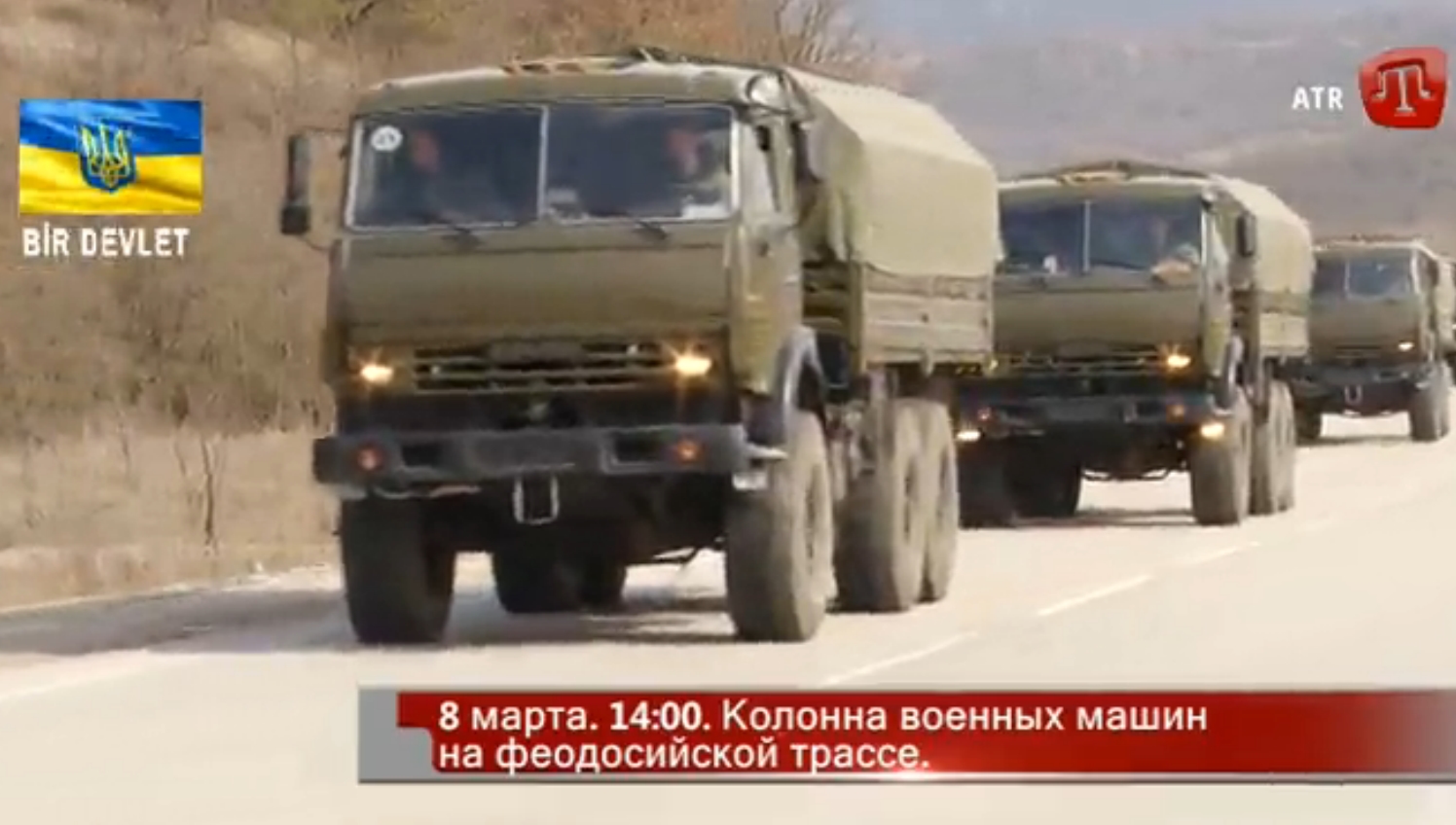After a day with its Internet site down, the Crimean Tatar TV station ATR was broadcasting again evidently from a different address on a server outside Moscow. The station aired footage from 8 March at 14:00 showing dozens of Russian military trucks on the highway from Feodosiya to Simferopol, as reported earlier by AP.