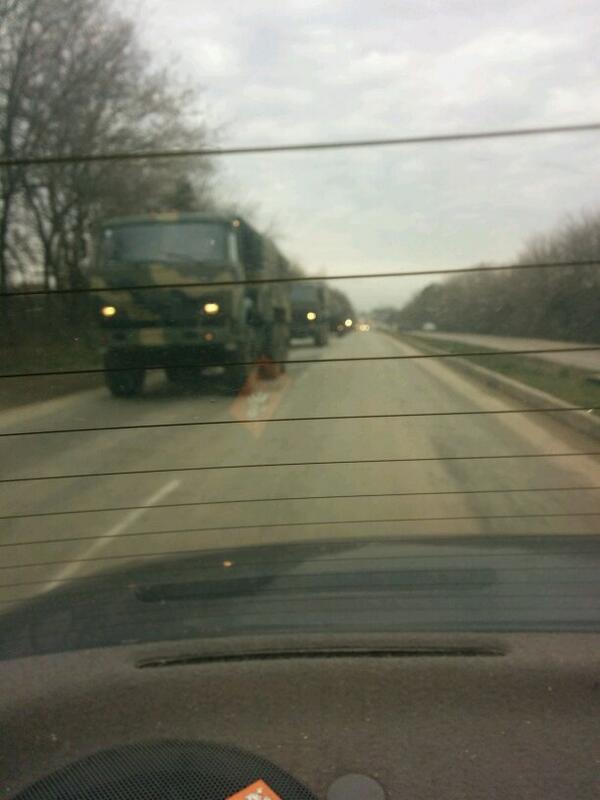 Convoy of 20 #Russia army trucks (without plates) full of soldiers just north of Simferopol 10minutes ago #Crimea pic.twitter.com/7KK7pg5Kqk