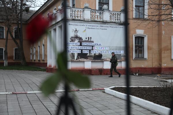 “The situation is changed. Tensions are much higher now. You have to go. You can’t film here,” said a Russian soldier carrying a heavy machine gun, his face covered except for his eyes, at a Ukrainian navy base in Novozernoye.