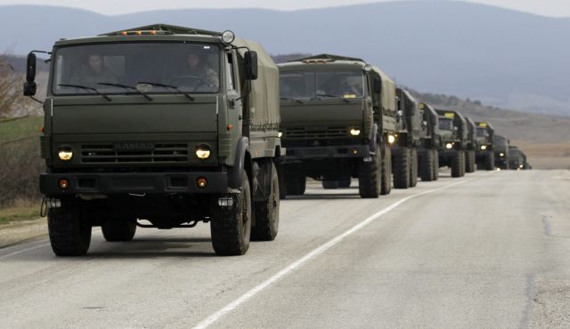 A convoy of military vehicles bearing no license plates travels on the road from Feodosia to Simferopol in the Crimea, Ukraine, Saturday, March 8, 2014. Photo by AP