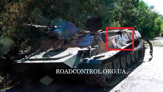 Yesterday, a convoy of Russian armor was geolocated to Sverdlovsk, between Lugansk and the Russian border (map). The vehicles were marked with green paint, often in exactly the same location as the picture above. We have not seen this paint before, but evidence strongly suggests that the convoy located yesterday, complete with 4 T-72s and the advanced Strela-10 anti-aircraft weapon, must have crossed the Russian border. While we can’t prove that the vehicle below was in Sverdlovsk yesterday, it might indicate that Russia is marking the vehicles it is sending across the border with this green paint.