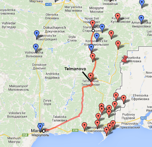 Telmanovo lies on a road that leads directly to Mariupol, as seen below: