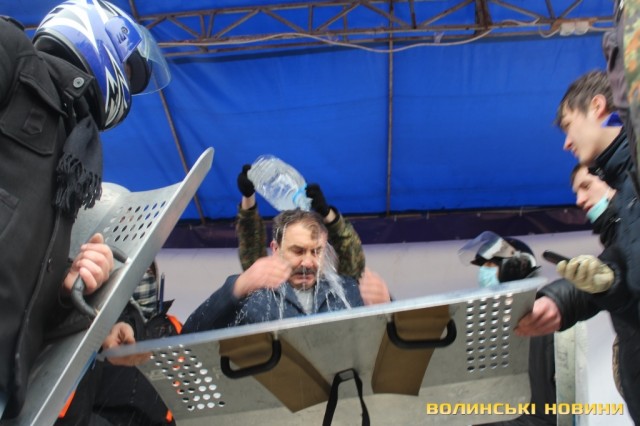 “Protesters captured Volyn Governor Alexander Bashkalenko, while storming the regional police office. Bashkalenko came out to the crowd along with police chief Alexander Tereshchuk. Protesters struck him in the head and then led him to a local ‘euro-maidan’ and handcuffed to a stage and poured cold water on him, demanding that he sign a letter of resignation,” the RIA Novosti news agency reports, quoting a local source.