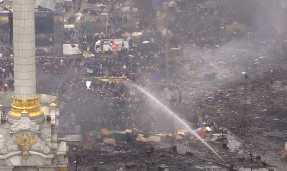 2031 GMT: The water cannons are intensifying, and there was just a large fireworks barrage fired by protesters. It’s unclear whether that signifies another police assault, however, as it is relatively calm. Riot police, as always, are staged just outside the shadows of Maidan’s fires, so an attack is always a possibility.