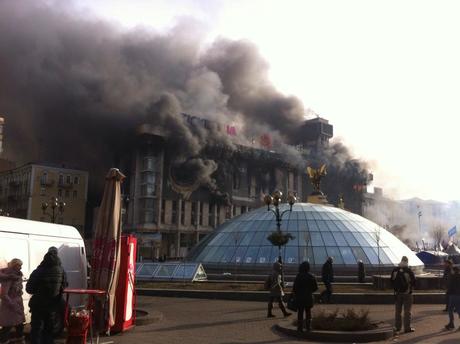 Meanwhile, this morning the burning hulk to the Trade Union building, the former headquarters for the opposition in Maidan, was still smoldering. Kyiv Post says this was take at about 9:27 a.m. today, about 6 hours ago: