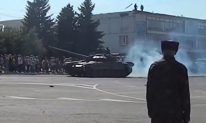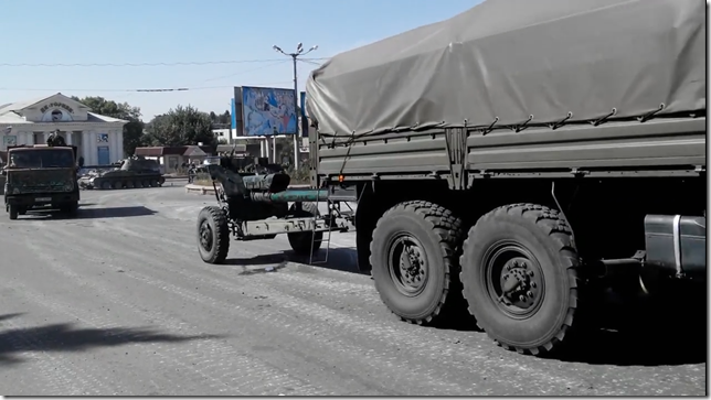 Now another new video of the parade has become available, which suggests that a Russian Federation military convoy was given to Russian-backed fighters. The video was uploaded to YouTube today, September 8, and is titled “Review of Kozitsin’s Cossacks.” This is a reference to Nikolai (Mykola) Kozitsin, a Cossack commander of the Russian-backed fighters. (Kozitsin previously figured in an intercept of conversations made by the Ukrainian Security Service (SBU) about the downing of the MH17.)