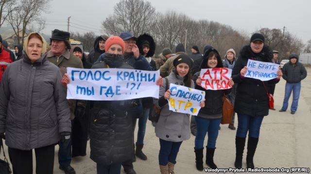 They marched in a column under Ukrainian and Crimean Tatar flags to the building from where ATR broadcasts and chanted “Freedom of speech!”, “Thank you, ATR!”, “Crimea is Ukraine!”