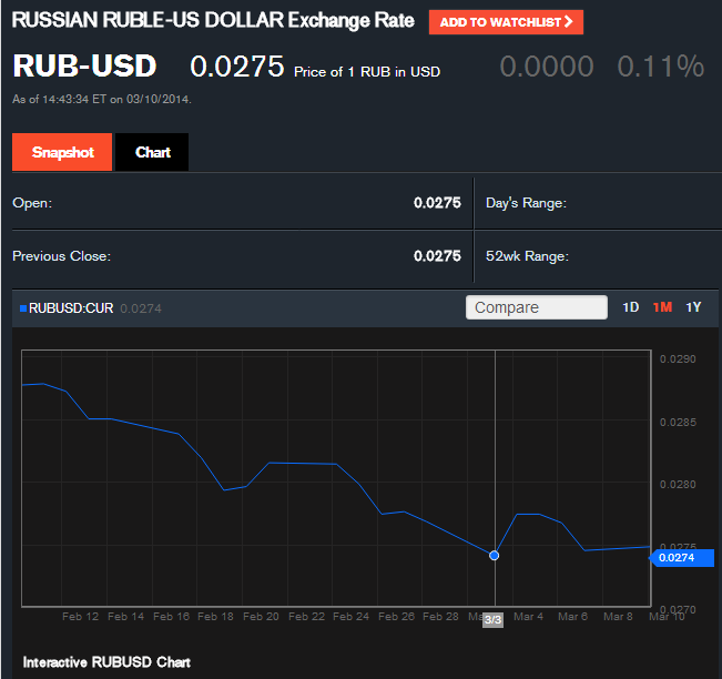 1856 GMT: Russia’s stock markets rebounded slightly on Friday (they were closed today), gaining a tenth of a percent. The Russian stock market is down 11.1% since the start if the crisis in Ukraine on February 18th, most of that drop came after Russian troops moved into Crimea, but the MICEX has stabilized in the last few days.