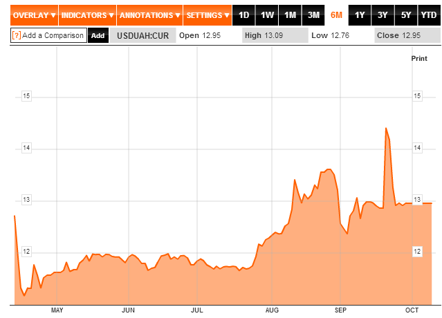The good news is that the Ukrainian Hryvnia does not appear to be in freefall at the moment. The currency has gained .26% today and is trading at 12.95 hryvnia per US dollar, according to Bloomberg. This is better than the currencies all-time low, hit on September 19th when the exchange rate reached 14.525 hryvnia per dollar.