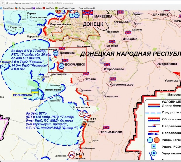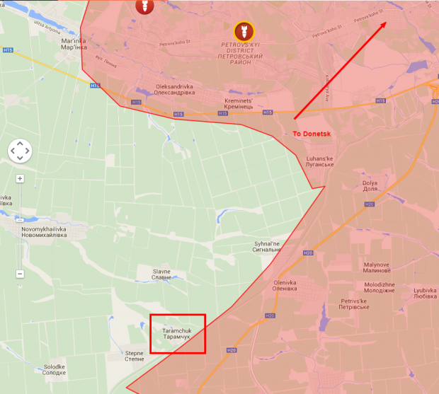 Meanwhile, it’s actually not clear who controls Taramchuk. The blogger “Dragon” (drakon_first_1) who supports the Russian-backed separatists also creates a daily map. While Tarmchuk is not on this map it is within the “narrow passage in dispute” highlighted by a red box — within the control of the Russian-backed separatists: