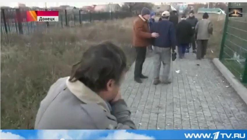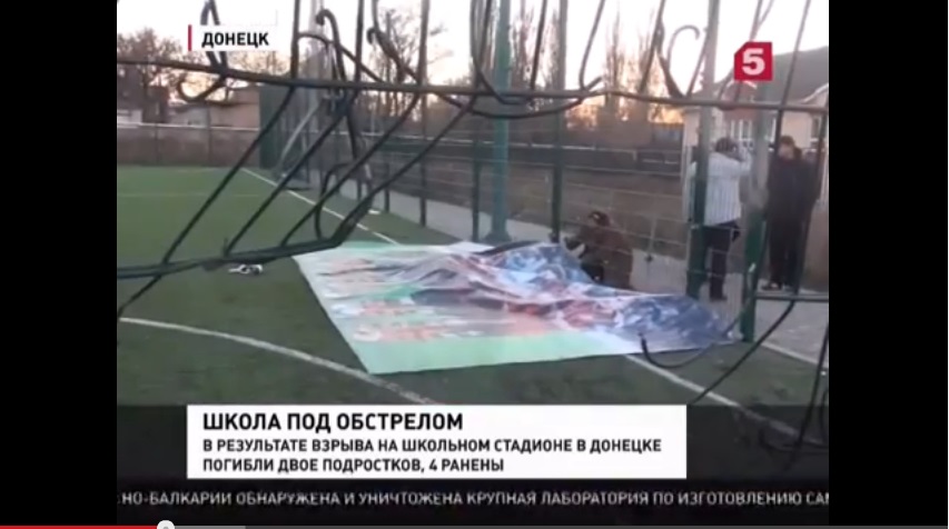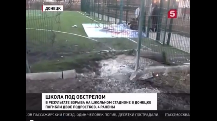 Vitaly Skraganyuk, one of the boys injured by shrapnel filmed by LifeNews said that first a shell “fell on his school” which he didn’t see, then a second one landed by the soccer field’s fence and exploded, killing killed two of his classmates (Warning: Graphic).
