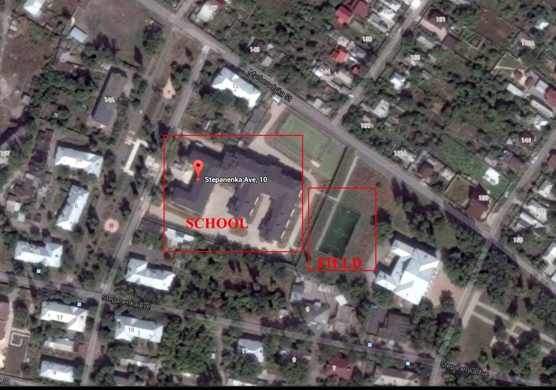This appears to match the view in Google Street View (2013) before the turf was laid and fence built, looking south from Mirogorodskaya Street toward Stepanenka Street: