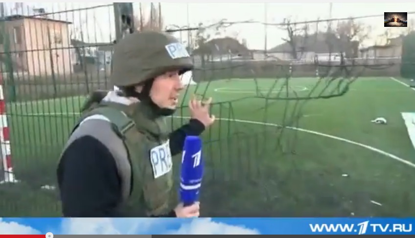 One photo shows a reporter from Russian state TV’s Channel 1 standing in front of the fence to the soccer field at the north end. The fence is dented in one direction from the racket, so it may have come from the left or east.