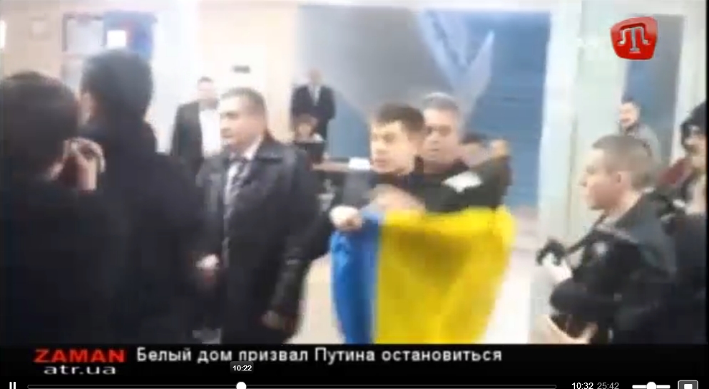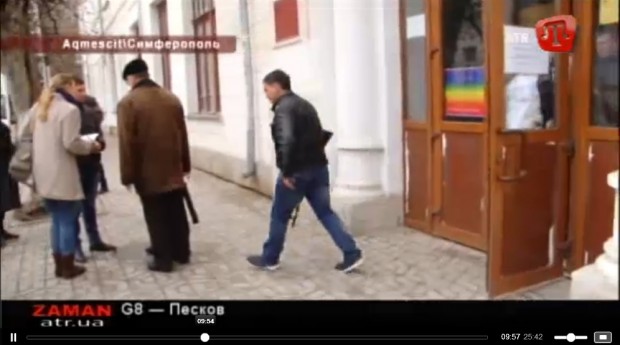 While Aksyonov himself was voting, a man tried to unfurl a Ukrainian flag and was hustled away by self-defense operatives.