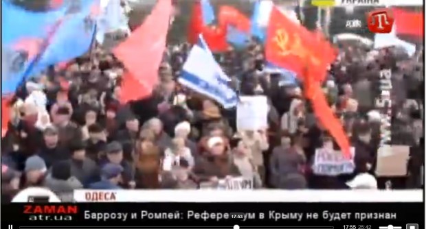 ATR reported that there were a number of pro-Russian demonstrations elsewhere in Ukraine, with some crowd staging mock referendums. One such demonstration in Odessa drew 5,000 people, some waving communist flags.