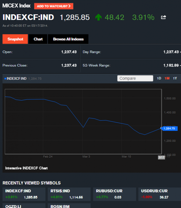 Today, Russia’s MICEX index rose 3.91%, but it’s still down nearly 15% since the start of the revolution in Ukraine on February 18th.