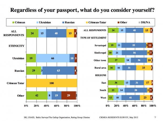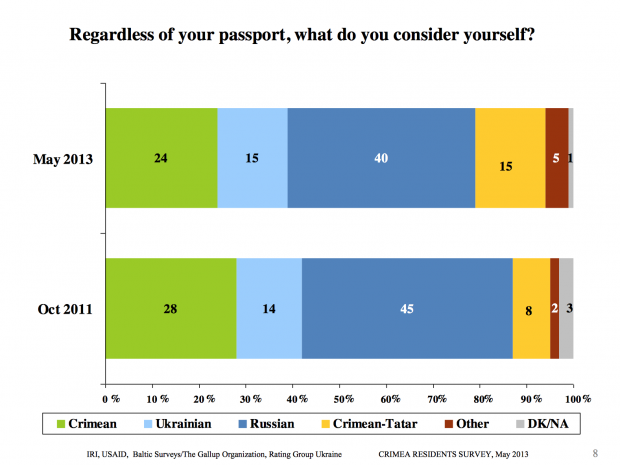 While it is fair to say that circumstances have changes, and so likely too have opinions, so if one assumes that 100% of those who are Russian voted to join Russia, that’s only 40%. According to the official results, 97% opted to join Russia. Where did the other 57% come from? This poll doesn’t really address the question of joining Russia or not. One also has to remember that, according to the official results, more than 80% of registered voters cast a ballot. If one assumes that all of those who identify as Tatar or Ukrainian either voted for independence or boycotted the vote, that assumption clashes with the official results. Also note that the trends between 2011 and 2013 show an increasing Ukrainian, Tatar, and Crimean population, with a shrinking Russian population.