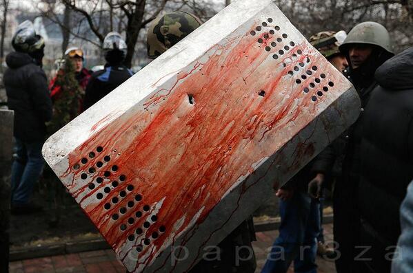 Blood soaked shield with bullet holes in it.#euromaidan pic.twitter.com/ervnrlt8w2