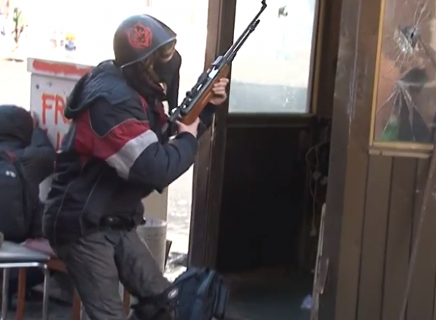 Armed groups shooting at people in the central Kyiv. Arm bands as reported are to protect from the police #euromaidan pic.twitter.com/D2XFBfEPYt