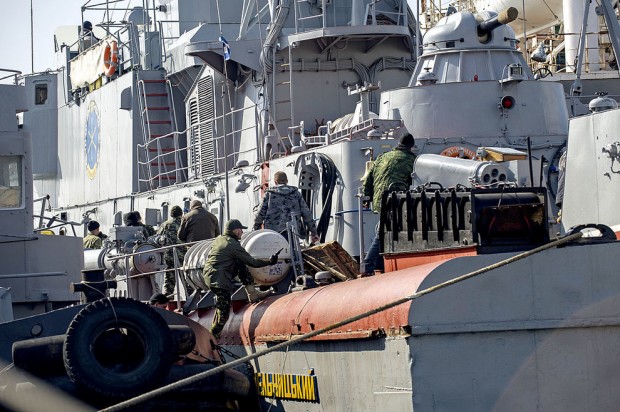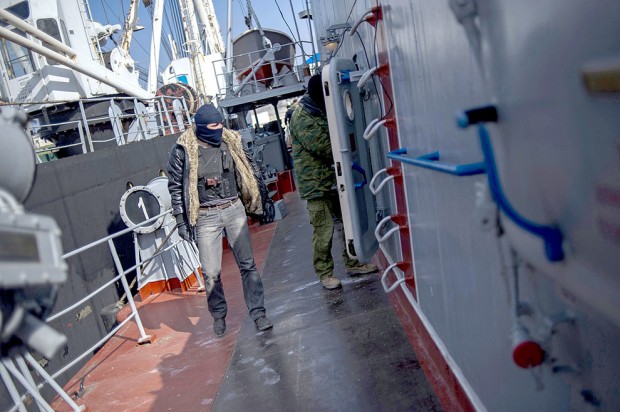 On Facebook, [Vladislav Seleznyov, the defence ministry’s spokesman in Crimea] said pro-Moscow militiamen and Russian soldiers cordoned off the area, while a boat with the gunmen on board approached the Ternopil and stormed it.