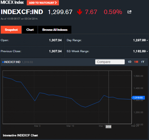 1427 GMT: Russia’s stock market continues to struggle. The MICEX index closed down another .59% today and is down 13.43% for the year: