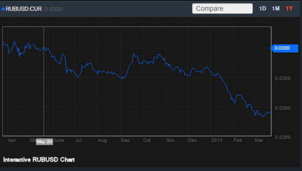 The ruble, on the other hand, has been slowly gaining since it plummeted to its extreme depths on March 13th.
