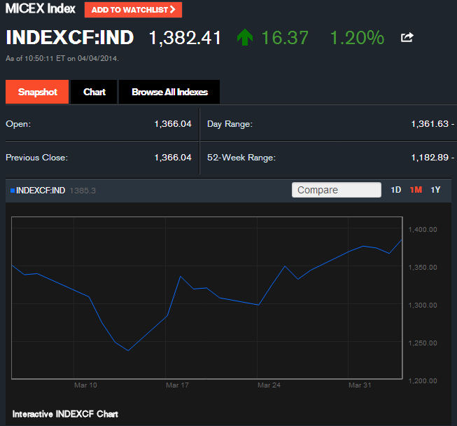 1848 GMT: The Russian MICEX Index closed up today, with a increase of 1.2%. The MICEX is now at its highest point since February when the Russian markets collapsed due to fears of Russian expansion and a global backlash: