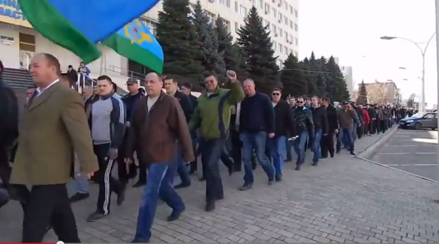 1522 GMT: A small crowd of pro-Russian demonstrators, waving the flag of the Russian Airborne Troops and the flag of the Soviet Airborne (not a Ukrainian flag as is claimed by some on the Open Newsroom), chant “Berkut, Berkut!” in support of the infamous riot police that were disbanded after the Yanukovych government fell. The video is titled “Gathering of Militia to the SBU,” a reference to the security services building which is occupied by pro-Russian separatists, and was reportedly taken in Lugansk today.