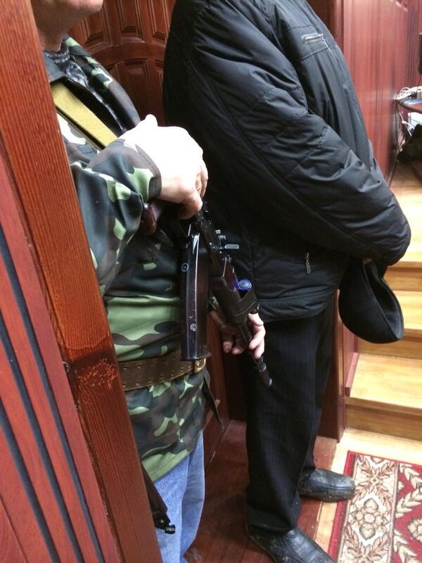 Just got inside occupied building in #Luhansk. Men carrying automatic weapons in full military dress lead us in!! pic.twitter.com/1UFcWzl8iV