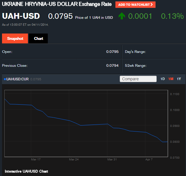After hemorrhaging all month, the Ukrainian Hryvnia actually increased in value today, adding .13% against the dollar.