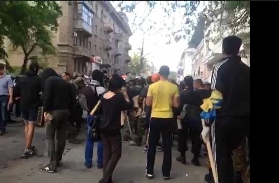Just moments ago, the narrators for one of the videos said “I don’t understand what’s going on.” Well, they are in the thick of the action, so that is a great summary of how confusing things have become. From the initial videos we’ve seen, it appears that pro-Russian crowds, armed with various clubs, riot shields, and helmets, attacked the pro-Ukrainian rally. Since then, we’ve seen people who appear to be supporters of both sides go on the offensive.