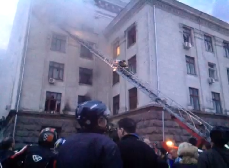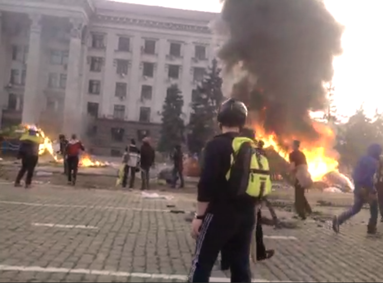 Clashes arose Friday in Odessa in the area of Grecheskaya St. between Anti-Maidan activists on the one side and Odessa and Kharkiv soccer club fans and EuroMaidan activists on the other side. Later in the evening, the riots then shifted to Kulikovo Field, where pro-Ukraine unity supporters destroyed an Anti-Maidan activists’ camp, and fire broke out in the trade union building where pro-Russian supporters were hiding.”
