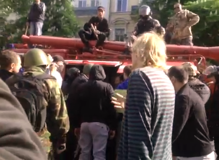 Now there was a fight in front of the firetruck. Some people wearing Ukrainian colors and waving Ukrainian flags were seen nearby, but it’s a very confusing situation, and it’s not clear which armed men are the separatists and which are not.