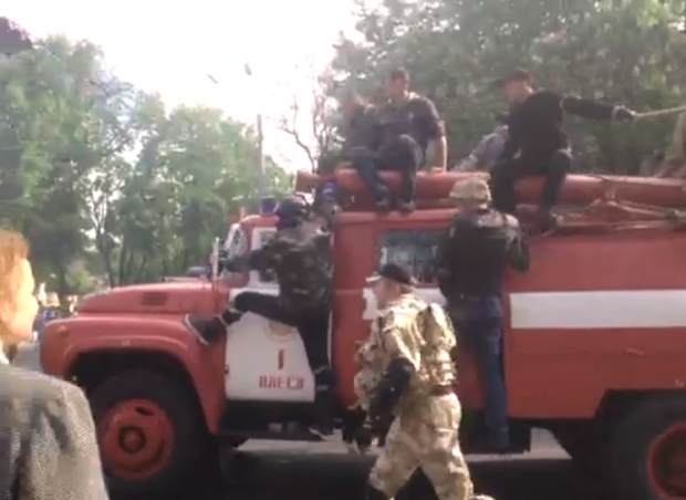 Moments ago, this firetruck drove down the street, loaded with men of an unknown agenda. They are now deploying the firehouse. Are these separatists or pro-Ukraine police?