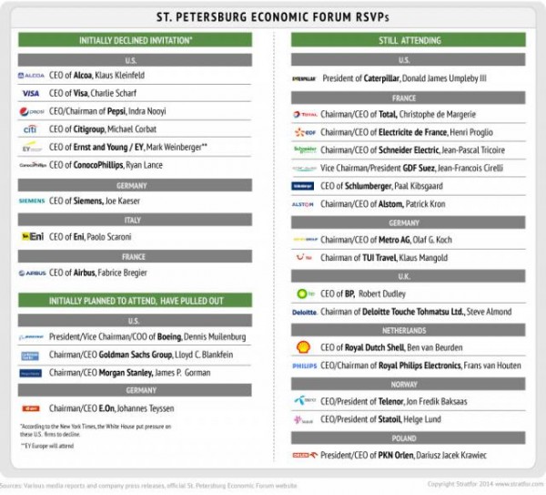 A graphic from Stratfor showing the names of CEOs of Western companies who have either declined to attend or are present at the St Petersburg Economic Forum today.