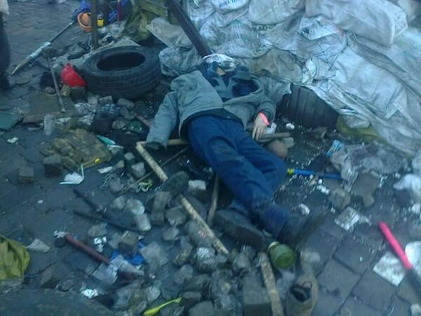 A dead woman on barricade near Metro.@fankaaa: Martwa kobieta na barykadzie w pobliżu metra Chreszczatyk. #euromaidan pic.twitter.com/04k00BgPdM
